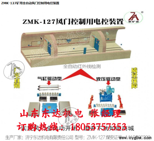 ZMK-127气动风门控制用电控装置(煤安证号:MAB090300)适用于煤矿井下双扇无压风门、单扇风门、行人、行车或人车共用风门等设施处全自动控制,可控制两道或三道风门。当行人和矿车通过时由该装置实现风门的自动启闭。在矿井停电时,可靠人力启闭风门。山东东达集团,联系人:张经理,电话:180-5375-7353
